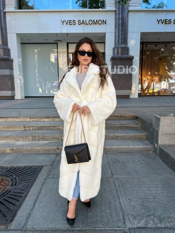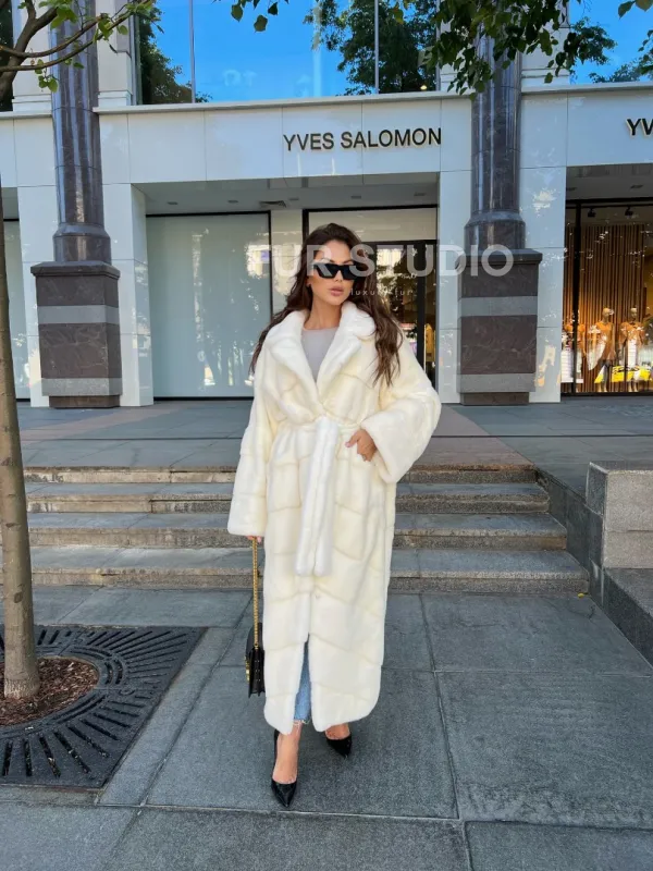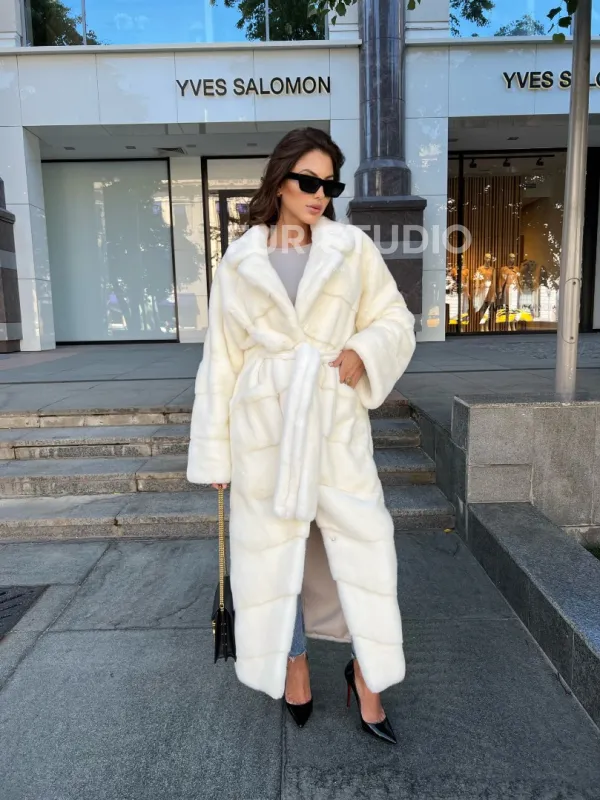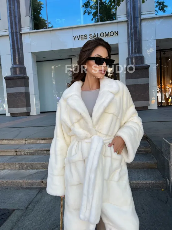Белая норковая шуба с поясом - в аукционной норке 100266