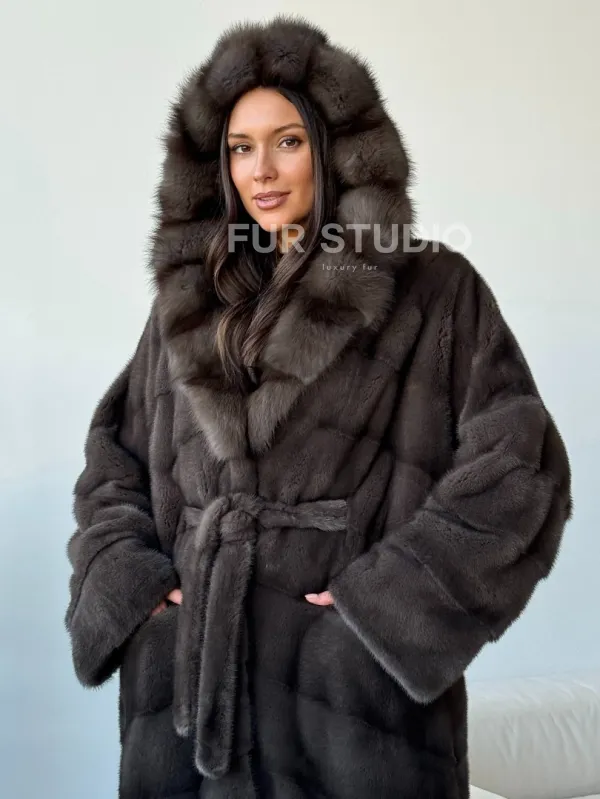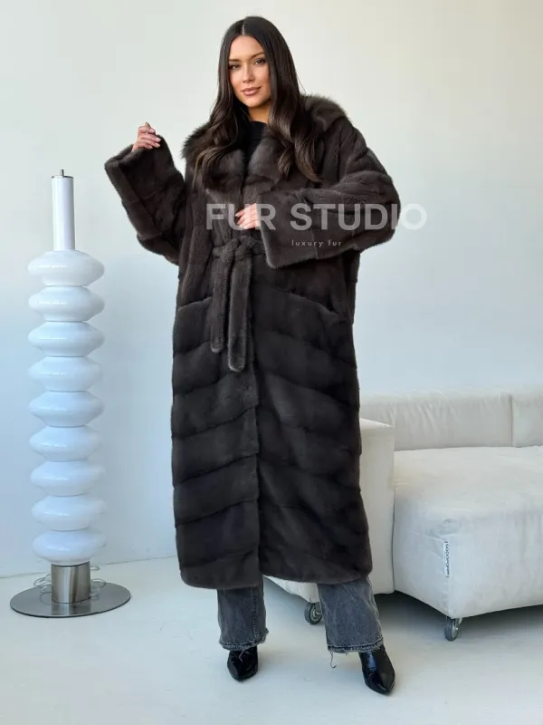 Длинная норковая шуба с капюшоном - графит 102494