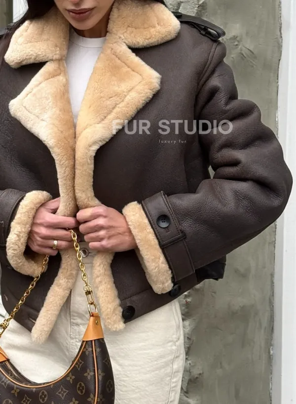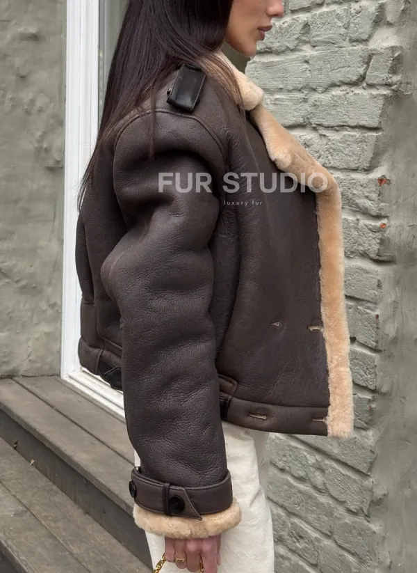 Кроп - дубленка двубортная Dark brown на пуговицах 101726