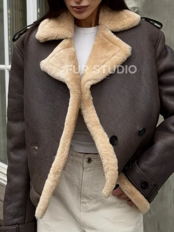 Кроп - дубленка двубортная Dark brown на пуговицах доступна для покупки в нашем шоуруме Furs Studio в , а также предлагается удобная доставка во все города России. Обогатите свой гардероб этой дубленкой, которая прослужит вам многие годы, добавив немного роскоши в ваш повседневный образ.