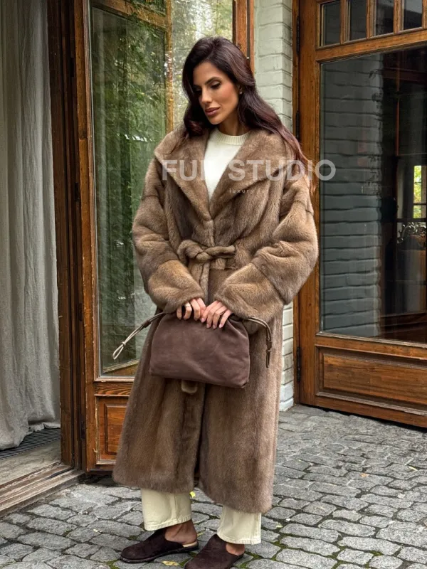 Мех данной шубы аукционная норка, цвет бежевый. Предлагается в размерах от 42 до 54. Длина модели 115-120 см, что выгодно подчеркивает фигуру девушек. Эта модель идеально подойдет для девушек и женщин, предпочитающих роскошные натуральные меха.