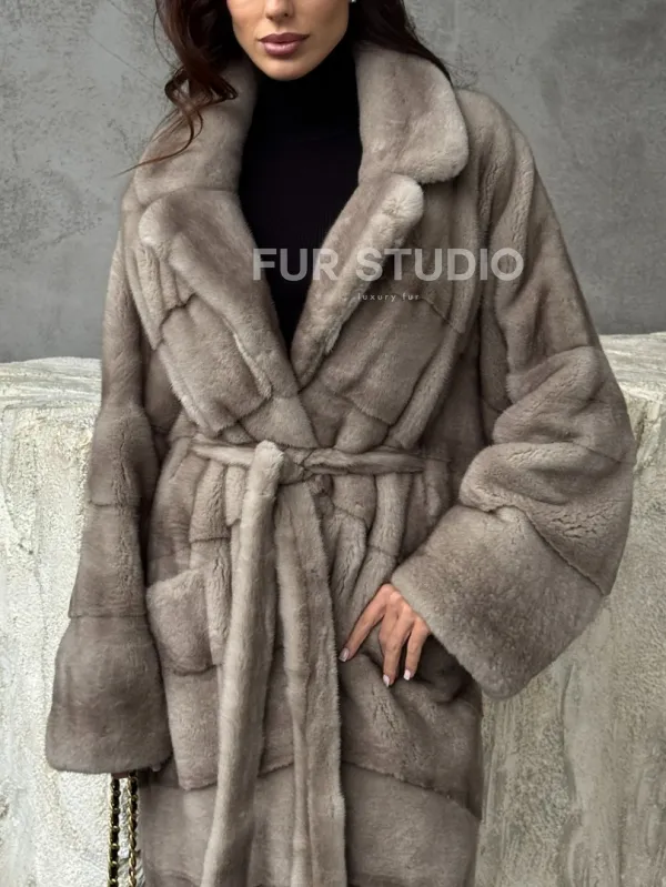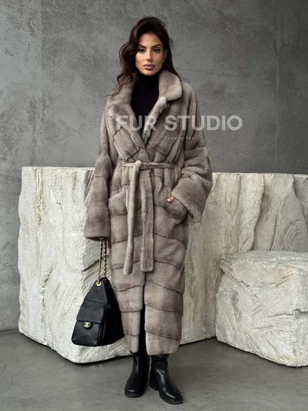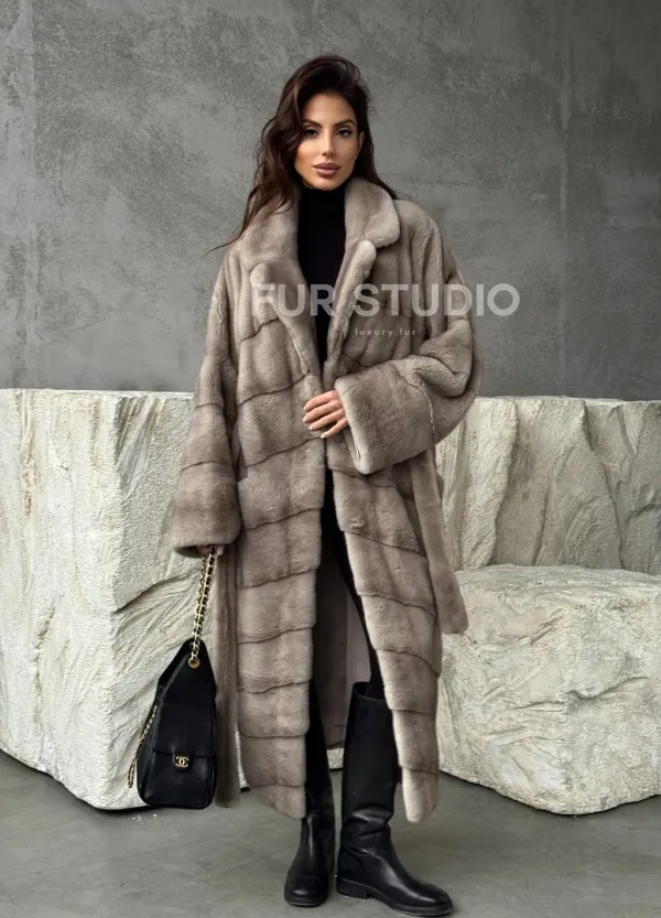 Удлинённая норковая шуба с поясом 102479